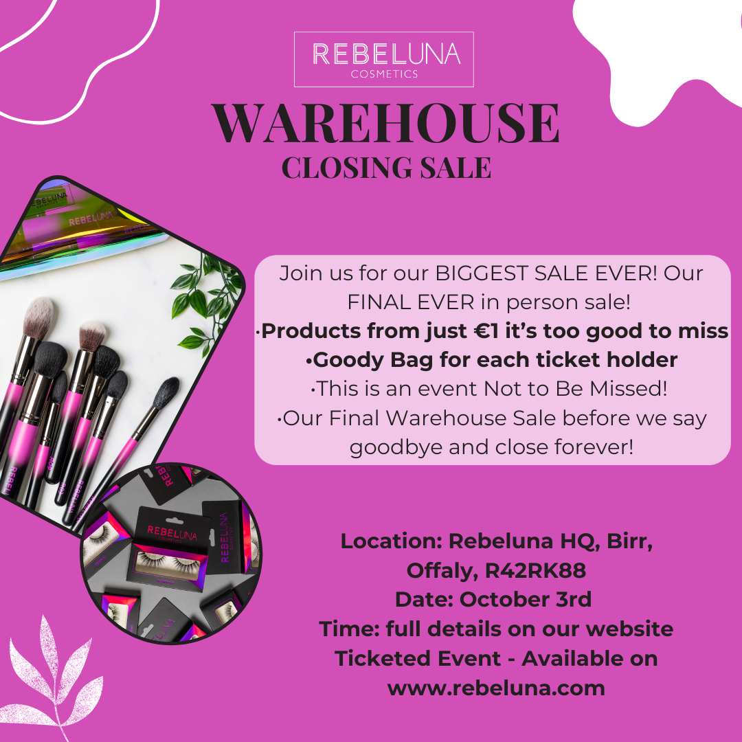 Join us in our Rebeluna Studio (located in Birr, Offaly, R42RK88) for our FINAL MASSIVE WAREHOUSE SALES. We’re CLOSING DOWN so we have huge offers across all products starting at just €1. Stock up before they are gone forever. Offers are exclusive to the in person warehouse sale and will not be available online. If you cannot attend we advise you have someone attend in your place as we will not be able to accommodate shipping products. You must purchase in person only to avail of the offers.